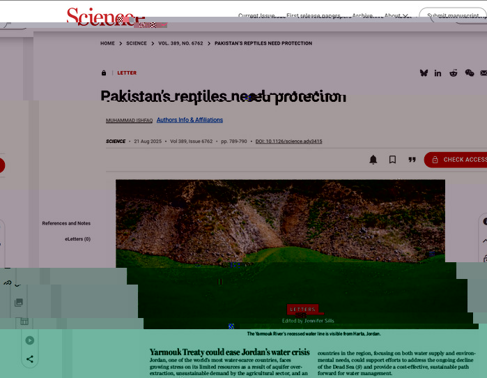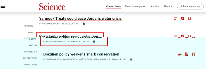 8月21日,我校計算機與人工智能學院教師Dr. Muhammad Ishfaq在國際知名期刊Science雜志以Letter形式發表評論文章“Pakistan’s Reptiles Need Protection”,3044am永利集团3044noc為第一作者及通訊作者單位。